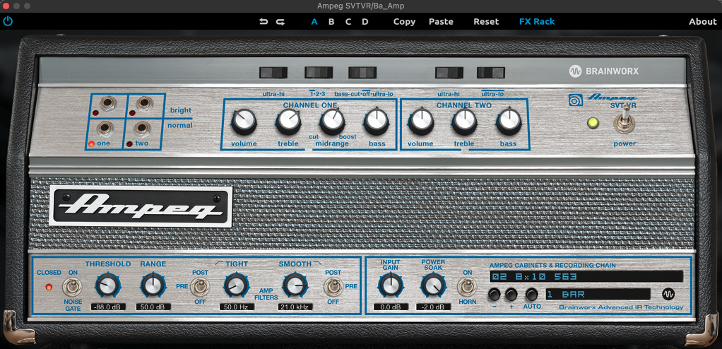 ableton Live上に2トラックを用意し、1つはRadial J48というD.Iを通ったLINE録音専用トラック。もう一つはAmpeg SVTを差し下記の設定でレイヤーしています。