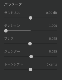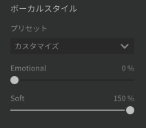 Maiさんのパラメータは下記の通り。特筆はEmotionalのかけらもなく、テンションがMax低い笑。指先も凍る冷ややかさです。。。SynthesizerVを導入して間もない為、各パラメータがどんな作用をするのか解らず使っていたのでこんな状態になっています。