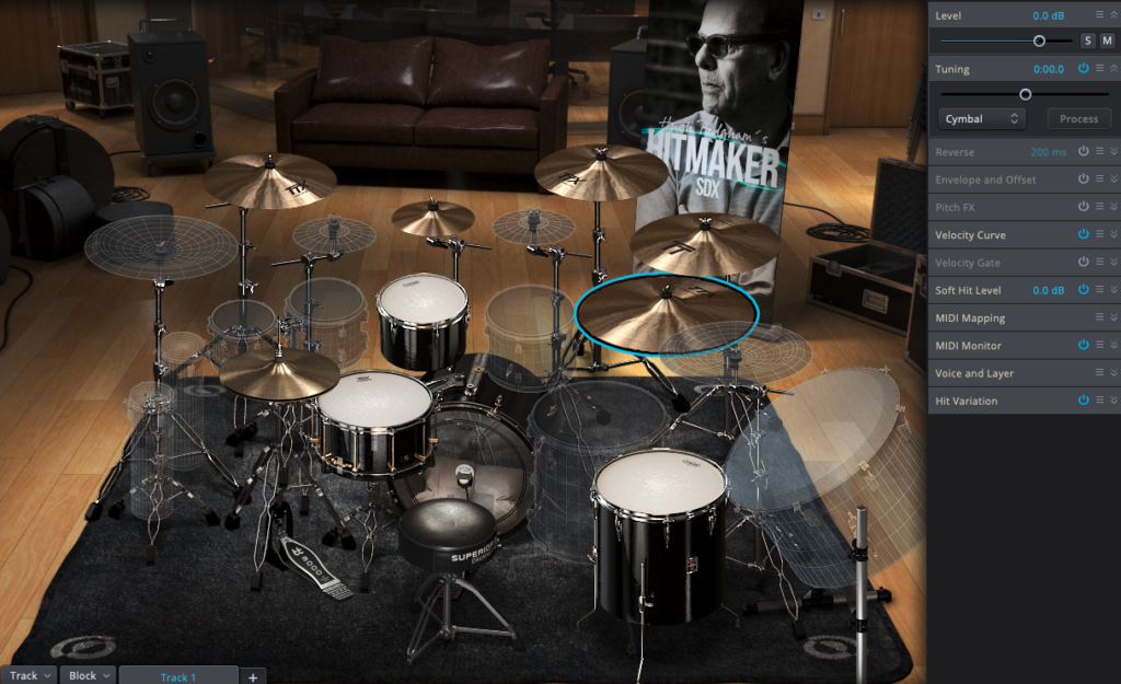 SUPERIOR DRUMMER 3のSDX「HIT MAKER」のCenterStageキットを使用しました。タムはハイとフロアを1つずつ残して他は外しています。このHIT MAKERというSDXはRideが気持ちよく鳴ってくれるのでお気に入りです。